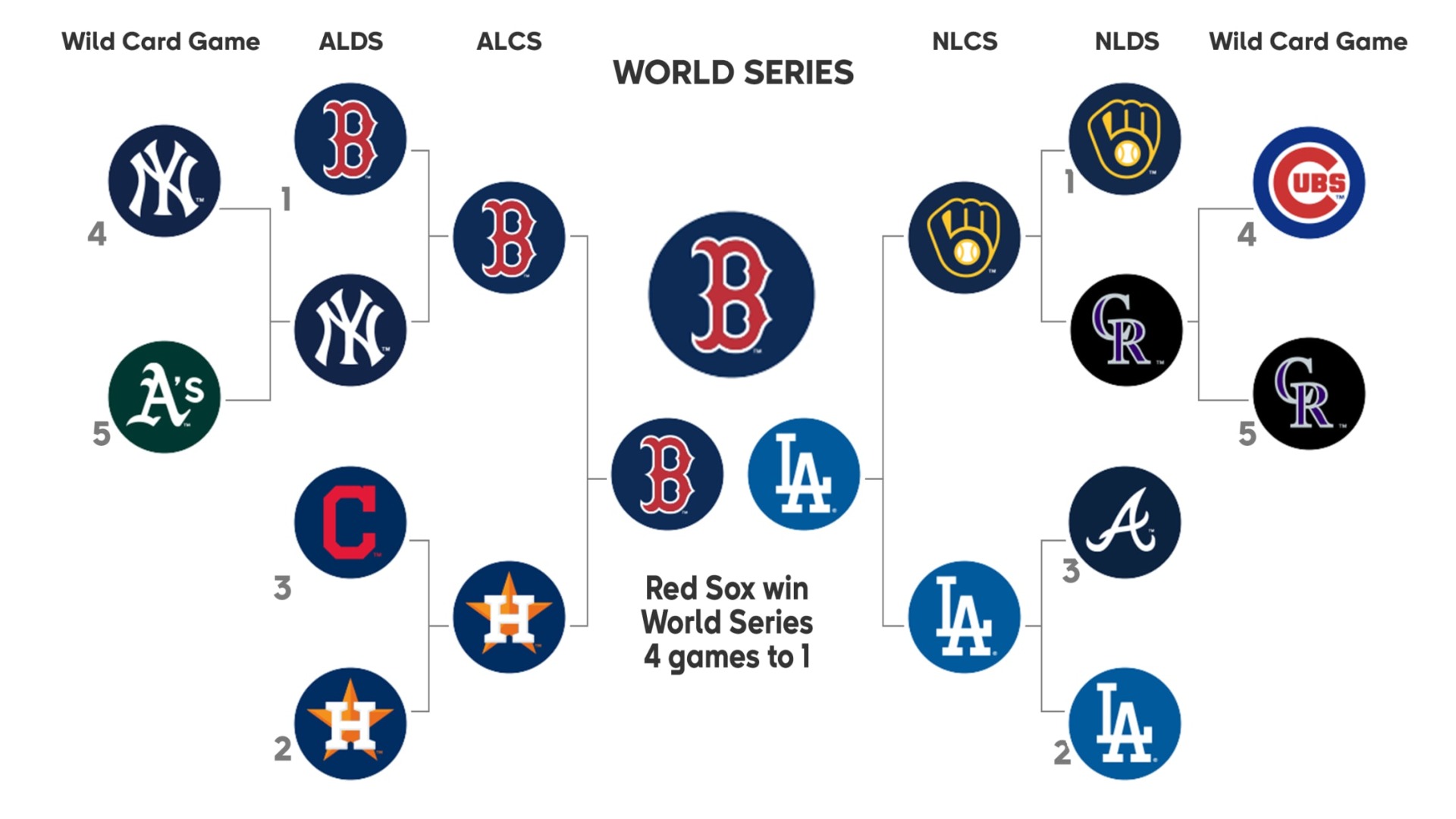 Runkosarjan loputtua kunkin divisioonan voittaja pääsee suoraan jatkoon ja molemmista liigoista kaikkien divisioonien neljänneksi ja viidenneksi parhaat joukkueet pelaavat yhden wild card ottelun toisiaan vastaan ja tämän voittaja etenee jatkoon. Eli yhteensä neljä joukkuetta kummastakin liigasta etenee jatkoon. Wild cardin voittaja pelaa liigan voittajaa vastaan ensimmäisen pudotuspelikierroksen. Ensimmäinen kierros pelataan paras viidestä menetelmällä. AL/NL mestaruustitteli sekä World Series mestaruus ratkaistaan muistakin lajeista tunnetulla paras seitsemästä ottelusarjalla. Alla kuva vuoden 2018 postseason kaaviosta. KUVA MLB.COM